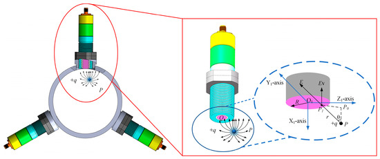 Figure 3 illustrates the electric field diagram generated by a particle with a charge of +q when it passes through point P near the non-invasive electrostatic sensor probe. The electric field lines emitted by the charged particles are distributed across the probe’s surface. According to the principles of electric field theory [38], it can be inferred that the electric field lines emitted by the particles are perpendicular to the probe’s surface, representing the induced charge on the non-invasive electrostatic sensor.