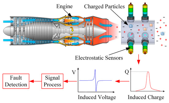 Changes in the engine operating conditions or malfunctions can alter parameters such as the temperature, particle concentration, gas velocity, or particle size distribution in the exhaust [40,41]. This, in turn, leads to variations in the overall electrostatic charge level within the engine’s gas path. These particles are in constant motion due to rapid flow, turbulence, vibration, and other factors. Consequently, they undergo contact, collision, and friction with and separation from other particles and the duct’s inner walls. These interactions result in the accumulation of electric charges on the particles, leading to electrostatic phenomena [42]. When charged particles pass over the sensor’s surface, they can induce an electrical current, converted into voltage by conditioning circuits. The magnitude of the induced voltage reflects the particle size, as it is related to the charge carried by the particles, and the charge’s polarity reflects the particles’ material properties. Figure 4 is a schematic of the engine exhaust gas electrostatic monitoring system.