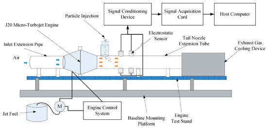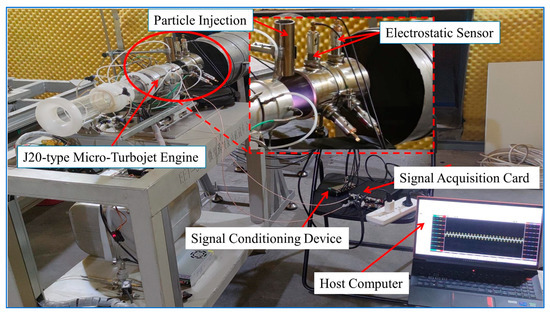 This section provides an experimental setup of a micro turbine engine to simulate faults in a real aero-engine. The focus of electrostatic monitoring lies in studying the abrasive particles generated by wear-type faults in the engine gas path. These particles are crucial in reflecting the specific fault characteristics of the gas path. To investigate the electrostatic properties of SiC/SiC abrasive particles under actual engine conditions, a J20-type micro turbojet engine electrostatic monitoring test bench is established. This equipment is manufactured by Changzhou Huanneng Turbo Power Co., Ltd., Changzhou, China. Figure 5 provides a schematic of the experimental system.