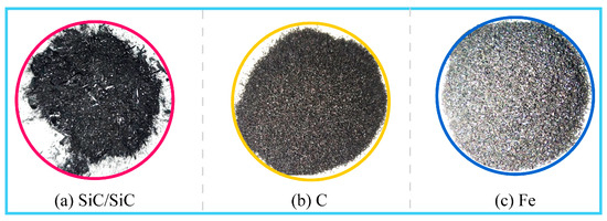 As shown in Figure 8, the SiC/SiC material used in the experiments is a typical CMC. It was prepared using the Chemical Vapor Infiltration (CVI) process by the Shanghai Institute of Ceramics. Fe and C particles are also compared with the SiC/SiC particles. The reason is that they are typically three different materials because Fe is metallic, C is non-metallic, and SiC/SiC belongs to composite materials, respectively.