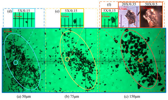 To provide a comprehensive analytical characterization of the SiC/SiC particles used in the experiments, optical microscopy was conducted using a high-resolution microscope to capture detailed images of the particles. Figure 9 shows microscopic images of SiC/SiC particles with sizes of 50 µm, 75 µm, and 150 µm. The 50 µm and 75 µm particles were imaged at 5× magnification, while the 150 µm particles were imaged at 5×, 20×, and 50× magnification. These images allowed us to analyze the particles’ size distribution and surface features, which are critical for understanding their behavior in the high-temperature and high-speed environments typical of aero-engine exhaust systems.