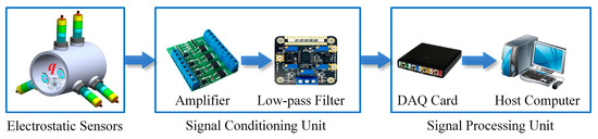 To suppress noise from the environment, the signals from the sensor electrodes are transmitted to the signal conditioning unit through coaxial cables. The electrical signals from the sensors are amplified and filtered by the signal conditioning unit. Subsequently, the signals are sampled using a data acquisition card and processed by the host computer. A block diagram of the measurement system is illustrated in Figure 10.