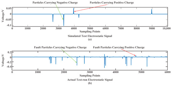 The pulse signals generated by the charged particles passing through the sensor indirectly reflect the polarity of the charge and the magnitude of the particles. In practical applications, the signals collected from the electrostatic sensor often contain noise [47], DC components, and baseline drift [48], which can lead to the drowning of feeble proper signals by noise. Therefore, noise is a significant obstacle in electrostatic monitoring and diagnostic technology.