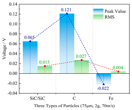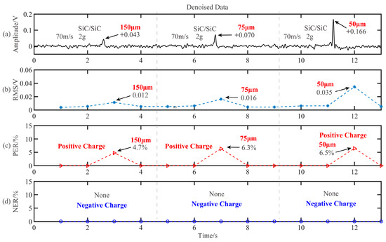 It can be observed that the peak values of the SiC/SiC abrasion particles corresponding to 150 μm, 75 μm, and 50 μm were 0.043 V, 0.070 V, and 0.166 V, respectively. The corresponding RMS values were 0.012 V, 0.016 V, and 0.035 V, and the corresponding PER values were 4.7%, 6.3%, and 6.5%. The change in the amplitude of the induced voltage still indicates that SiC/SiC particles carry a positive charge after friction with the airflow. Moreover, as the particle diameter decreases, the amplitude of the induced voltage shows a clear trend of a gradual increase. Additionally, it was found that with a decrease in the particle size, the ratio of the corresponding event rates also increased.