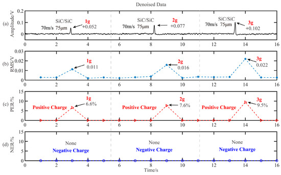 This paper adopts the following signal denoising process to extract the characteristics of electrostatic signals from particles and ensure the accuracy of SiC/SiC electrostatic analysis. First, the DC component from the signal is removed [49], and then the CEEMDAN [50] method is employed to eliminate noise. Finally, data smoothing [51] is performed on the signal. Figure 11a displays the raw signals collected in this experiment, containing three simulated fault signals. However, the original signals are heavily contaminated with noise, with the second simulated fault signal nearly submerged by noise. Figure 11b shows the signals after processing and denoising using the abovementioned method. It is evident that this approach effectively filters out much of the noise, and the three simulated fault signals are now clearly visible. Therefore, this signal processing method successfully extracts the valuable components from the data.