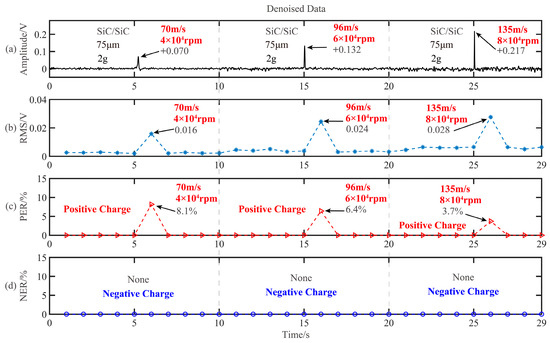 Figure 22a shows the electrostatic time-series signals of the SiC/SiC particles at different engine speeds after noise reduction. Figure 22b–d display the corresponding RMS, PER, and NER parameters, respectively. The analysis results indicate that the SiC/SiC particles become charged due to friction with the pipe walls or airflow under the influence of the engine exhaust, causing significant fluctuations in the electrostatic sensor signal amplitude. It was observed that the amplitude of the induction signal increases with the exhaust gas velocity. This is likely because higher gas velocities increase the collision intensity of particles with the pipe walls and accelerate the separation process, leading to an increase in the charge of the SiC/SiC particles.