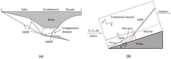 Figure 1 shows the ODE schematic (a) and the computation domain (b). As is shown in Figure 1a, the structure of the ODE is simple, including an inlet, a combustor, and a nozzle. Firstly, the inflow is compressed by two OSWs and the fuel and air are assumed to be premixed well at the inlet. After the compression of the inlet, the supersonic premixed combustible mixture reflects on the wedge to induce an OSW with a high post-shock temperature that triggers rapid heat-release chemical reactions, resulting in the formation of the ODW. The computation domain is presented in Figure 1b, which is a 30 mm × 15 mm rectangular area. The gray zone is the wedge, and the solid black line represents the wall. In this paper, viscosity is considered, so the wall condition is set to a non-slip isothermal boundary condition, and the wall temperature is 300 K. The short red line on the wall represents the hot-spot at a high temperature, which can be generated by laser irradiation on the wall. Like our previous studies [40], the wedge angle θ is fixed as 25°. The left and the upper dashed line are the inflow condition, and the right dashed line is the outflow condition.