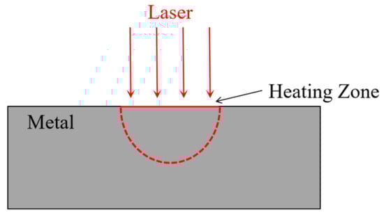 To study the effect of hot-spots on ODW, a high-temperature region was set on the wedge to simulate the presence of a hot-spot. When there is laser irradiation of metal, composite materials, etc., part of the laser energy is absorbed by the surface layer of the material, which will increase the temperature of the material. Several past studies have demonstrated the feasibility of using lasers to heat the surface of materials, either numerically or experimentally [41,42,43]. Figure 2 shows the schematic of the laser heating material. To analyze the temperature field distribution of continuous laser-irradiated materials, the differential equation of solid thermal conductivity can be established by Fourier’s law. Assuming that there is no heat source inside the material and the laser enters in the direction of the vertical material surface, then the heat conduction equation can be expressed as