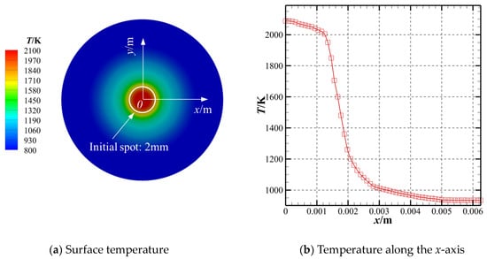 Figure 3 shows the temperature distribution of the tungsten surface after 1 s irradiation by a laser with Q0 = 19,000 W/cm2. It can be observed that the high temperature region almost coincides with the initial laser spot, and the temperature of the tungsten surface drops rapidly outside the laser irradiation area. The temperature of the hot-spot can be controlled by adjusting the laser power density and irradiation time, and the relationship between the power density of the laser and the highest temperature of the hot-spot is given in Table 2, which provides a reference for the laser selection.