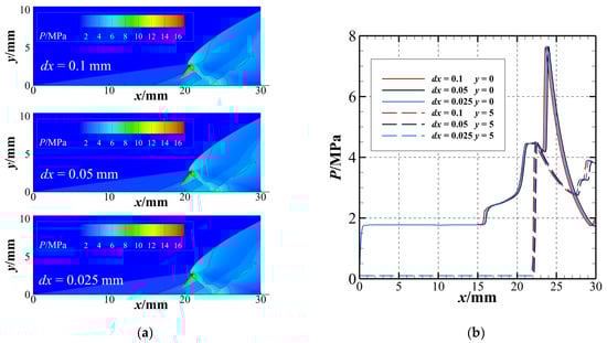 To eliminate the influence of grid resolution on numerical simulation results, in this paper, three grid sizes (dx = dy = 0.1 mm, dx = dy = 0.05 mm, and dx = dy = 0.025 mm) were used for the initial calculation, and the flow parameters are T0 = 300 K, P0 = 101,325.0 Pa, and M0 = 7. Figure 4a shows the pressure contours of ODW in three grid scales, the main structure of the flow field consists of an OSW, an ODW, and a triple-wave point connecting them. Figure 4b shows the pressure distribution along different lines parallel to the x-axis in different grid scales. The results of pressure contours in Figure 4a show that the wave structure at the three grid scales is consistent. Figure 4b shows that there are some differences between the results of dx = 0.1 mm and those of dx = 0.05 mm and dx = 0.025 mm, but at the grid size of 0.05 mm and 0.025 mm, the pressure distributions along the different straight lines almost coincide. Therefore, to save on computing costs, the grid size of 0.05 mm was used for subsequent numerical calculations.