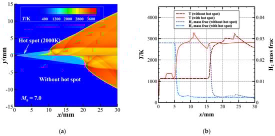 (a) Temperature fields of ODWs and (b) mass fraction (H2) and temperature along the line of y = 0.05 mm without and with a hot-spot for M0 = 7.0, T = 2000 K, δ = 2 mm, xhot-spot = 2.06 mm.
