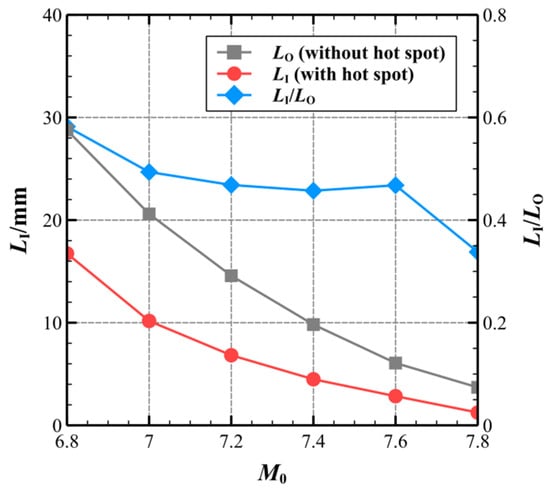 Figure 6 compares the position of the oblique shock-detonation transition of the original ODW without a hot-spot to that of the ODW with a hot-spot as a function of inflow Mach number. Compared with the original ODWs without hot-spots, the position of the oblique shock-detonation transition with hot-spot control is significantly shorter. With or without hot-spot initiation, LI follows nearly the same trend as M0 increases. The blue line represents the ratio of LI controlled by the hot-spot to the original LI, the LO. It can be observed that in the cases where xhot-spot is 10% of the original LI, during the increase of M0 from 6.8 to 7.6, the LI with hot-spot control is found in between 40% and 60% of the original LI, and most are close to 50%. The difference is that when M0 increased to 7.8, the LI/LO rapidly decreased to approximately 35%. This is because in case M0 reaches 7.8, the original initiation position is too close to the position of the hot-spot, and in this case, the size of the hot-spot has a relatively obvious effect on ODW initiation, resulting in a rapid decrease of LI/LO. The effect of the size of the hot-spots on ODW initiation is discussed in Section 3.2 Together, these results demonstrate that introducing a hot-spot in the induction zone is an effective method to accelerate the initiation of the ODW.