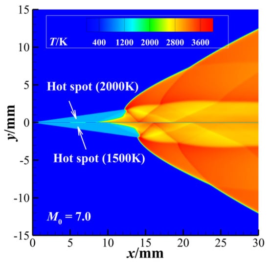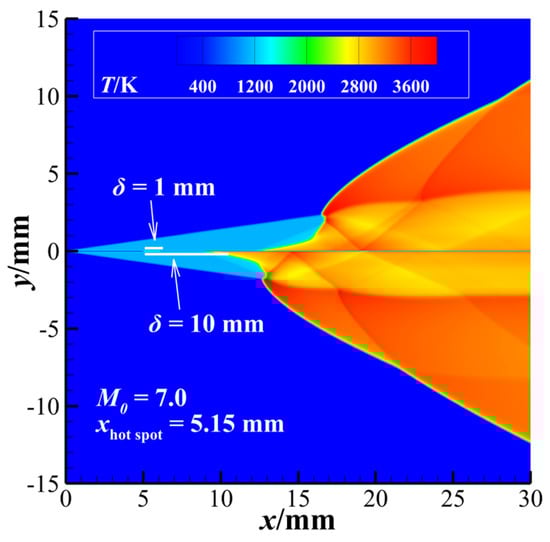 Temperature fields for a hot-spot-controlled ODW in two sizes of hot-spot (δ = 1 mm and δ = 10 mm) for M0 = 7.0, xhot-spot = 5.15 mm, T = 1500 K.