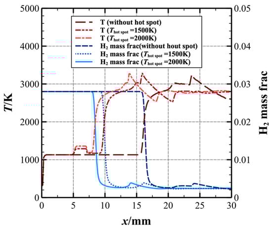 Temperature and mass fraction of H2 along the line of y = 0.05 mm in the ODW without and with a hot-spot for M0 = 7.0, T = 2000 K, T = 1500 K, δ = 2 mm, and xhot-spot = 5.15 mm.