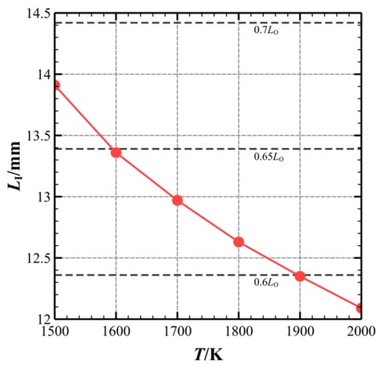 The characteristic length of the induction zone as a function of hot-spot temperature (M0 = 7.0, δ = 2 mm and xhot-spot = 5.15 mm).