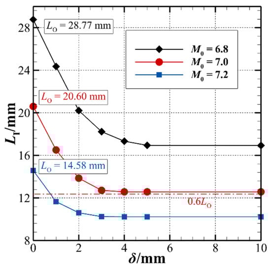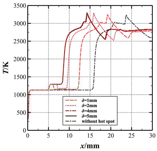 Figure 10 shows the ODW temperature fields controlled by a hot-spot of size δ = 1 mm and δ = 10 mm. Compared with the original ODW without a hot-spot controlled, the position of the triple-wave point moves upstream from near x = 20.60 mm to approximately x = 16.46 mm at δ = 1 mm and approximately x = 12.61 mm at δ = 10 mm. Figure 11 shows the characteristic length of the induction zone as a function of hot-spot size at three Mach numbers; it can be observed that the characteristic length of the induction zone becomes shorter as the hot-spot size increases. It should be noted that there is a maximum hotspot size at different Mach numbers, beyond which the length of the induction zone does not change. At Mach 6.8, the maximum hot-spot size is 5 mm, at Mach 7.0, the change in LI becomes very small after the hot-spot size exceeds 4 mm, and at Mach 7.2, the LI does not change after the hot-spot size is more than 3 mm. From the above results, it can be inferred that the higher the Mach number at the same hot-spot temperature and position, the smaller the maximum hot-spot size so that the length of the sensing region LI does not change. To illustrate this phenomenon, Figure 12 demonstrates the temperature distributing along the line close to the x-axis in the ODW without and with a hot-spot at different δ. Similar to the higher hot-spot temperature, the larger hot-spot size makes the mixture to maintain a higher temperature after passing through the hot-spot. The reaction rate of the elementary reaction is determined by the Arrhenius formula [47], which is sensitive to the temperature, so higher mixture temperatures can make the rapid chemical reactions occur faster. After the size of the hot-spot exceeds 4 mm, the initiation of the chemical reaction occurs within the hot-spot range; thus, the position of the triple-wave points changes little after the hot-spot size exceeds 4 mm, and almost never changes after exceeding 5 mm.