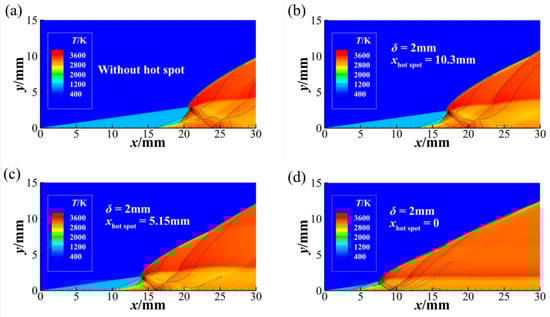 Temperature fields overlapped with pressure contours in the cases of M0 = 7.0, T = 2000 K, δ = 2 mm and without hot-spot (a), xhot-spot = 10.30 mm (b), 5.15 mm (c), 0 mm (d).
