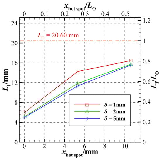 The ODWs with different positions of the hot-spot are shown in Figure 13. The position of the hot-spot is determined by the characteristic length of the induction zone of the original ODW without a hot-spot, being 50%, 25%, and 0% of the original LI, respectively. The temperature fields overlapping with pressure contours clearly shows that these cases are all with abrupt transition [3,51], and there are second ODWs between the deflagration wave and the main ODW. It can be observed that, after adding a hot-spot to the wall, the position of the triple-wave point moves upstream as the hot-spot position moves upstream, and the length of the second ODW becomes shorter in this process. According to Teng’s theory [51], this may be caused by the different intensities of the compression wave. To further illustrate the effect of the position of the hot-spot on the initiation distance, Figure 14 demonstrates the characteristic length of the induction zone as a function of the position of the hot-spot. It can be observed that the characteristic length of the induction zone is sensitive to the position of the hot-spots. As the hot-spot position moves upstream, the characteristic length of the induction zone becomes significantly shorter. If a 2000 K hotspot is at the beginning of the wedge, then the ODW’s initiation distance will be reduced to about 30% of that without hotspot acceleration. In summary, the ODW initiation can be controlled in ODE by adjusting the position of the hot-spot on the wall.