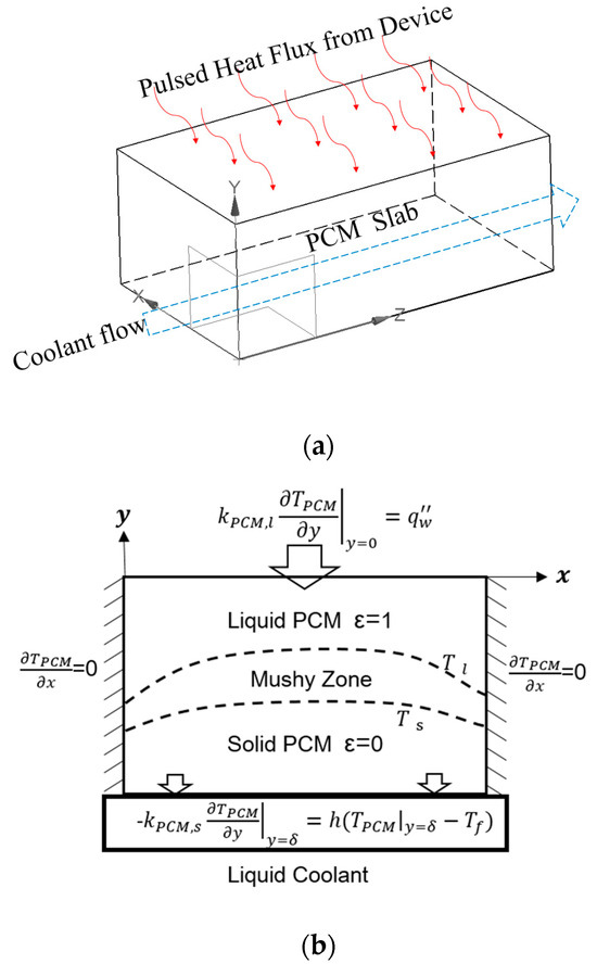 Schematic diagram of the heat transfer process with phase change. (a) Three-dimensional heat transfer process; (b) Two-dimensional cross-section diagram in the direction of heat transfer process.