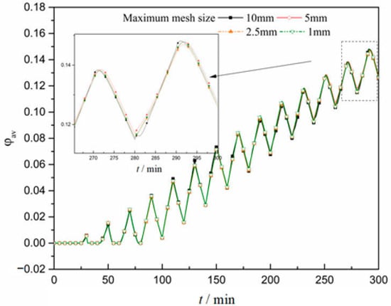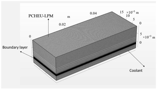In the above equation, characterizes the differential component of the phase interface position with time. After substituting the constraint Equations (11) and (12) into Equations (1)–(5), they are discretized using the second-order backward difference method, respectively, and solved implicitly in the time and geometric domains using the alternating direction (ADI method) and using the finite element method. The grid cells are divided according to the finite volume method, and the boundary layer grid near the wall is locally encrypted. The mesh division result is shown in Figure 3, which is composed of a structured tetrahedral mesh. There are 5 boundary layers with a thickness of y+ = 0.105 mm on the coupling surface between the PCM and coolant. The results of the grid independence check are shown in Figure 4, and it can be seen that the error is less than 3% when the minimum size of the grid is less than 2.5 mm, which meets the calculation requirements.