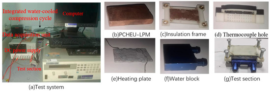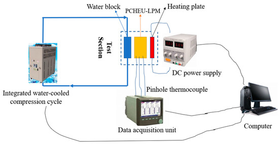The experimental setup utilized to validate the aforementioned PCHEU-LPM simulation model is illustrated in Figure 5 and Figure 6. In Figure 5, the PCHEU-LPM (depicted in Figure 6b) is thermally interfaced within a water-cooled compression cycle system (depicted in Figure 6a). At the top of the PCHEU-LPM, an aluminum alloy plate, partially embedded with copper wires, serves as the heating plate (depicted in Figure 6e) to simulate a 12 W heat source. This heating plate is connected to a direct current power supply. Surrounding the PCHEU-LPM is a 3D-printed framework (depicted in Figure 6c) designed for insulation, composed of cured silicone rubber material. The framework features 1 mm apertures on one side, allowing for the insertion of nine K-type thermocouples (depicted in Figure 6d). The bottom of the framework is hollowed out and directly connected to a copper water-cooling head through screws (depicted in Figure 6f).