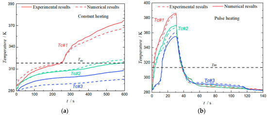 Comparison between experimental temperature results and numerical results. (a) Constant heating mode; (b) Pulse heating mode.