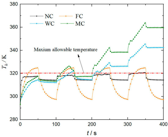 The loading form of the combination boundary conditions have a direct impact on the distribution of temperature and phase fields in the PCHEU-LPM. On the top of the PCHEU-LPM, a pulsed heat flux is uniformly applied with a heat flux density of 50,000 W/m2, while four different cooling methods are applied at the bottom: 1. Natural cooling (NC), 2. Fan cooling (FC), 3. Water cooling (WC), and 4. Microchannel cooling (MC), with corresponding convective heat transfer coefficients of 20 W/m2·K [17], 100 W/m2·K [18], 1500 W/m2·K [19], and 10,000 W/m2·K [19], respectively. The corresponding interface temperature results are plotted in Figure 8. From Figure 8, it can be observed that the use of natural cooling and fan cooling results in poor heat dissipation, with the interface temperature rapidly rising beyond the permissible temperature range of the device. Water cooling exhibits better heat dissipation performance, with lower interface temperature and smaller temperature fluctuations. For microchannel cooling, due to its excessive heat dissipation coefficient, when the pulsed heat flux at the top is loaded to a valley point, the temperature of the PCM rapidly decreases below the phase transition temperature zone, resulting in an increase in interface temperature fluctuations. This is because the PCM’s thermal conductivity plays a dominant role in the internal total thermal resistance, and the excessively high convective heat transfer coefficients are meaningless when the thermal conductivity of the PCM is limited. For the PCM with a thermal conductivity of approximately 12 W/m·K, water cooling proves to be the most suitable cooling method.