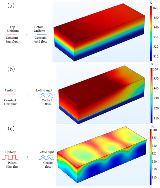 Temperature field distribution under different boundary condition combinations. (a) Constant heat flux with constant cold flow; (b) Constant heat flux with coolant flow; (c) Pulsed heat flux with coolant flow.