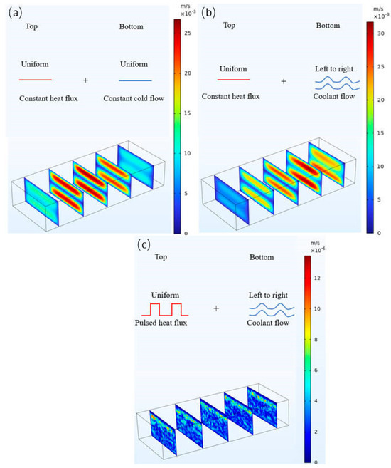 Velocity field distribution under different boundary condition combinations. (a) Constant heat flux with constant cold flow; (b) Constant heat flux with coolant flow; (c) Pulsed heat flux with coolant flow.