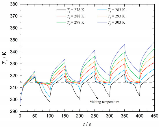 (3) The temperature fluctuation and uniformity of the PCM interface are directly related to the position of the phase interface, and the temperature fluctuation is minimized when the oscillation motion of the phase interface is always maintained near the interface under pulse thermal excitation. The position of the phase interface is related to the inlet temperature and inlet velocity of the coolant. The inlet temperature cannot be too high or too low, and there is an optimal value. The higher the inlet speed, the better, but there is a limit, beyond which the temperature control effect no longer changes.