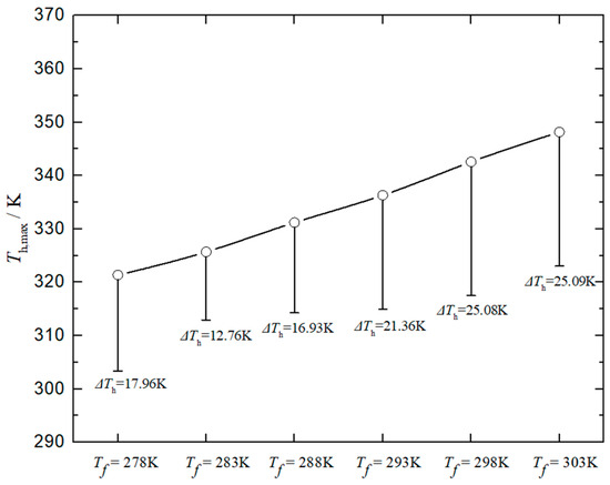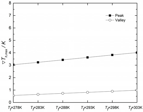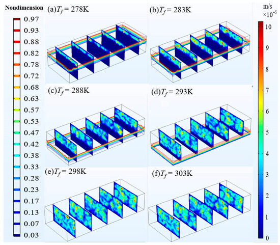 To investigate the impact of the incoming coolant flow temperature on the temperature response of the PCHEU-LPM heating surface, the coolant’s incoming temperature was varied from 283 K to 303 K while keeping the other parameters constant. Figure 11 depicts the response curves of the heating surface interface temperature for different incoming flow temperatures. Figure 12 presents the maximum temperature values , and the temperature fluctuations at the interface for different incoming flow temperatures . Figure 13 shows the maximum gradient of interface temperature at the corresponding peak and valley values of pulse thermal excitation with different . Figure 14 shows the three-dimensional velocity profiles and phase field contours of the PCHEU-LPM at the same time instances. The results depicted in Figure 11 and Figure 12 indicate that a higher incoming flow temperature leads to a reduced temperature difference between the bottom of the PCHEU-LPM and the cooling fluid, resulting in an elevated overall temperature level and an increase in the interface temperature. However, the temperature fluctuations of the heating surface exhibit a decreasing trend followed by an increasing trend as the incoming flow temperature rises. This observation suggests the existence of an optimal coolant temperature. When the incoming flow temperature is below 283 K, the convective heat transfer temperature difference becomes excessively large, causing the interface temperature of the PCHEU-LPM to rapidly decline by more than 15 K during the pulse cycle when the heat stimulus is zero, dropping below the phase transition temperature. Conversely, when the incoming flow temperature exceeds 283 K, the convective heat transfer temperature difference becomes too small, resulting in a rapid increase in the interface temperature during the pulse cycle when the heat stimulus is 50,000 W/m2. In the absence of heat stimuli, effective heat dissipation becomes challenging, leading to heat accumulation. According to Figure 13, the inlet temperature of the coolant mainly affects the uniformity of the interface temperature at the peak moment of thermal excitation. The higher the inlet temperature, the larger the corresponding temperature gradient. Based on the analysis of the results in Figure 12, Figure 13 and Figure 14, it is found that the distribution of the phase zone is the reason for the interface temperature response and temperature uniformity changes. When the interface is in the two-phase region instead of being undercooled or overheated, corresponding to = 283 K in Figure 14, the temperature fluctuation is the lowest. When the flow intensity in the liquid phase region of Figure 14 increases with , the temperature non-uniformity in Figure 13 increases with the increase in natural convection intensity.