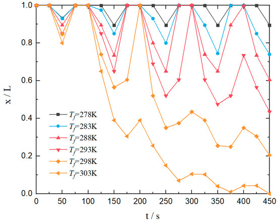 In summary, the interface temperature fluctuations and temperature uniformity of the PCHEU-LPM are influenced by the motion mode of the phase interface position. The position of the phase interface is related to the inlet temperature of the coolant. When the inlet temperature is appropriate, the phase interface always maintains oscillatory motion near the end face, as shown in Figure 15.