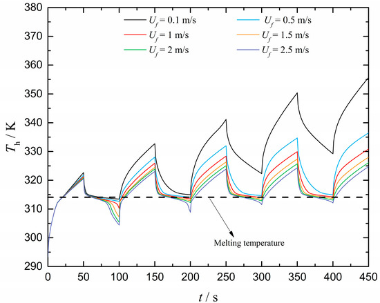 Response curves of the heating surface interface temperature Th for different incoming flow velocities.