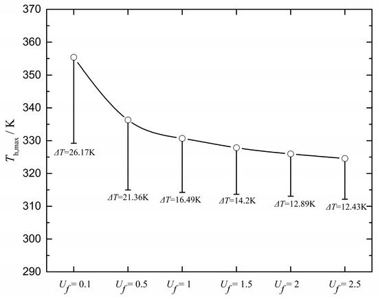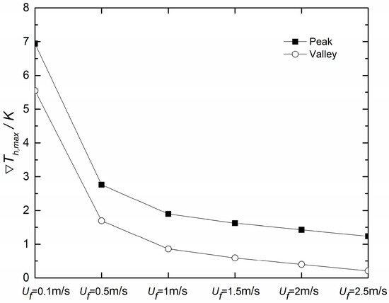 To investigate the impact of the incoming coolant flow velocity on the temperature response of the PCHEU-LPM heating surface, the incoming velocity was varied from 0.1 m/s to 2.5 m/s while keeping other parameters constant. Figure 16 presents the response curves of the heating surface interface temperature for different , while Figure 17 displays the corresponding maximum temperature values and temperature fluctuations at the interface. Additionally, Figure 18 shows the maximum gradient of interface temperature at the corresponding peak and valley values of pulse thermal excitation with different . Moreover, Figure 19 provides three-dimensional velocity profiles and phase field contour plots of the PCHEU-LPM at the valley time (t = 400 s) and peak time (t = 450 s) of the pulse cycle for different incoming flow velocities. The results depicted in Figure 16 and Figure 17 indicate that a higher incoming flow velocity leads to a larger convective heat transfer coefficient, resulting in the PCHEU-LPM reaching a temperature that closely aligns with and remains constant at the cooling fluid temperature. Consequently, the peak temperature at the surface decreases, and temperature fluctuations diminish. However, Figure 17 reveals that the suppression effect on temperature fluctuations follows a parabolic curve, gradually diminishing as the incoming flow velocity increases. As shown in Figure 18, decreases as increases, and the decreasing trend gradually flattens. Although the larger the is, the better the heat dissipation effect; for the PCHEU-LPM, there is a limit to its heat dissipation capacity, which depends on the thermal conductivity of the PCM. The reason is consistent with the analysis in Section 3.1, because the thermal conductivity accounts for the dominant factor in the total thermal resistance of the heat transfer system. Figure 19 illustrates that the distribution of the phase zone affects the temperature fluctuations and uniformity at the interface. When the phase interface approaches the PCM interface as increases, the interface is in a phase transition process and temperature fluctuations are suppressed. The lower the velocity field that characterizes the intensity of natural convection, the smaller the interface temperature gradient, and the better the uniformity.
