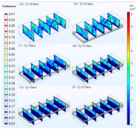 Furthermore, the non-steady-state pulsed heating and uneven water cooling will impact the temperature and phase field distribution of the PCHEU-LPM. When subjecting the PCM to a uniformly distributed constant heat flux at the top hot end and a uniformly distributed constant cold flux at the bottom cold end (with a negative surface heat flux density), the resulting temperature field is depicted in Figure 9a, while the corresponding velocity field is illustrated in Figure 10a. Alternatively, when a uniformly distributed constant heat flux is applied to the top of the PCM, and a cooling fluid undergoes cooling from the left to the right at the bottom, the resulting temperature and velocity fields are presented in Figure 9b and Figure 10b, respectively. In the case of a uniformly distributed pulse heat flux at the top of the PCM and simultaneous cooling of a fluid from left to right at the bottom, the resulting temperature and velocity fields are shown in Figure 9c and Figure 10c. The analysis of Figure 9 and Figure 10 reveals that under the scenario where both the hot and cold ends experience uniformly distributed constant heat flux, the temperature field exhibits a layered structure with uniform variation along the direction of the heat flux. However, when the cold end transitions into a cooling fluid flowing from left to right, heat exchange between the cold fluid and the PCM occurs. This leads to the absorption of heat by the cold fluid throughout the process, resulting in a gradual increase in its temperature. Consequently, the temperature difference between the PCM and the cold fluid decreases, manifesting as a temperature difference between the inlet and outlet and a larger cross-sectional velocity field along the process. In the situation where the hot end experiences a pulse heat flow and the cold end becomes a cooling fluid flowing from left to right, the combined effect of frequently changing heat flow and cold flow induces a transformation in the temperature field of the PCM into an uneven surface. Simultaneously, the size of the velocity field rapidly decreases. Although no apparent flow vortices are generated, localized small vortices with minimal changes in velocity gradient are observed.