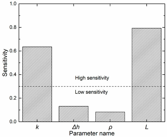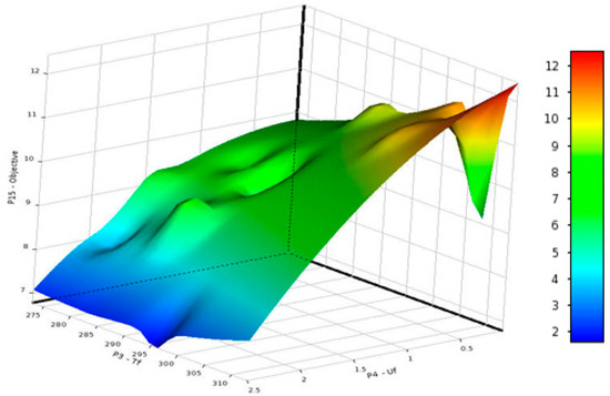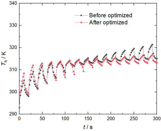 Recognizing that Equation (13) encompasses both non-steady-state boundary conditions and a transcendental term H, rendering a direct solution challenging, the Response Surface Analysis (RSA) method is employed. Initially, parameters associated with temperature fluctuations, as expressed in Equation (18), are identified. Subsequently, a target function for minimizing temperature fluctuations, as depicted in Equation (19), is formulated. Finally, a Response Surface Model (RSM) is established to represent the relationship between the target function and the set of parameters. Analysis results based on Equation (18) indicate that, in addition to the inlet temperature and inlet velocity parameters of the cooling fluid at the heat dissipation boundary, the interface temperature fluctuation is influenced by the thermal conductivity, thickness, density, and latent heat of the phase change material (PCM). To simplify the model, sensitivity analysis is conducted on these four sets of material properties with respect to temperature fluctuations, yielding the results presented in Figure 21. According to the results depicted in Figure 21, parameters ρ and λ are identified as highly sensitive, while α and Δ belong to the category of low-sensitivity parameters. Consequently, ρ and λ are treated as fixed values, and an RSM model is exclusively established for α and Δ, as illustrated in Figure 22. Ultimately, by identifying the parameter set corresponding to the lowest point in Figure 22, the optimal values for the rectangular PCHEU are determined and documented in Table 2. By comparing with the unoptimized interface temperature curve, the temperature fluctuation value decreased to 77.9% after adopting the optimal parameter value, as shown in Figure 23.