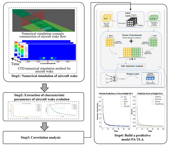 The remainder of this paper is organized as follows: Section 2 introduces the aircraft wake numerical simulation methods employed, feature parameter extraction, and a detailed description of the proposed PA-TLA framework. Section 3 describes how high-fidelity aircraft wake simulation data are generated in CFD, compared with field-detected LIDAR data, and the PA-TLA model’s predictive effectiveness is validated, concluding with an analysis of near-ground wake evolution characteristics combining numerical simulation and the PA-TLA model. Section 4 includes related discussions and summaries.