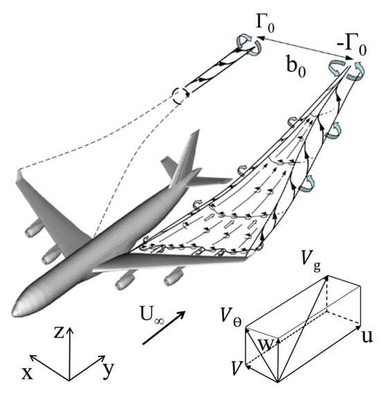 According to the Kutta–Joukowsky theorem [20], the circulation of an aircraft’s wake is related to various factors such as the flight speed and the wing airfoil geometry and distribution. Upstream velocity refers to the airspeed flowing over the aircraft wing surface before the generation of the wake vortex. Since this study only considers still air conditions, the upstream velocity is approximately equal to the aircraft’s final approach speed. When an aircraft with a lift coefficient , aspect ratio , and wingspan flies at a speed , the lift it generates equals the momentum flux of the rolled-up wake vortices. This can be expressed as