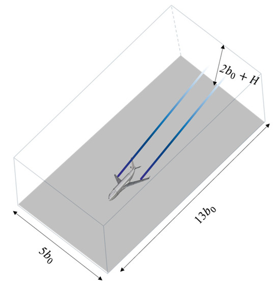 In light of this, and from the perspective of studying the wake dissipation mechanism influenced by continuous variations in approach altitudes, this paper utilizes the User-Defined Function (UDF) secondary development interface tool integrated with the FLUENT 2024 R1 software. It selects the Hallock–Burnham tangential velocity model for the initial model of the wake vortex and structures the flow domain into grids. The maximum grid resolution is set to 0.021 , and the minimum grid size in the wake region is 0.1 m × 0.1 m. The calculation domain, where the x-direction is the aircraft’s approach direction, the y-direction is the wingspan direction, and the z-direction is the altitude direction, forms a hexahedral configuration of . This is illustrated in Figure 4.