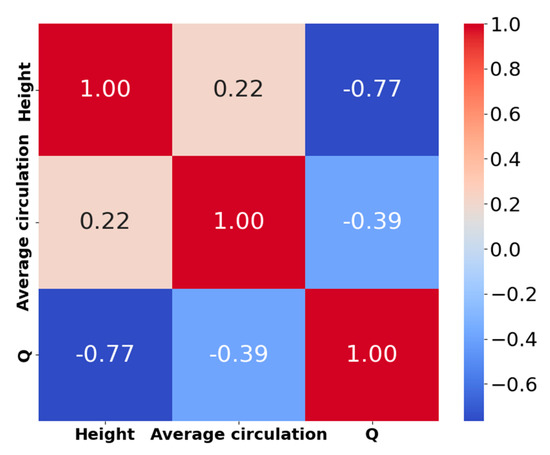To investigate the effect of the initial altitude at which aircraft wake vortices are generated on their evolution, an analysis of the correlation between altitude and extracted wake vortex parameters was conducted using the Pearson correlation coefficient. According to Figure 5, there is a positive correlation coefficient of 0.22 between altitude and the initial circulation of the aircraft wake vortex, indicating that as altitude increases, the initial circulation of the wake vortex also tends to increase. Moreover, the correlation coefficient between altitude and the Q-criterion value of the aircraft wake vortex is −0.77, demonstrating a strong negative correlation. This suggests that as altitude increases, the Q-criterion value of the aircraft wake vortex tends to decrease, indicating that the evolution of aircraft wake is significantly influenced by altitude.
