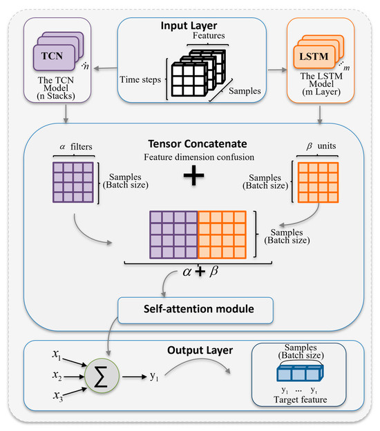 where represents the target output value, is the input, denotes the weight values, stands for the bias values, refers to the Rectified Linear Unit, is the number of filters in the last stack of the TCN, and is the number of units in the last layer of the LSTM. Due to the lack of sensitivity to the temporal features within the sequence data of LSTM and TCN, they fail to capture the intrinsic connections within the data, limiting their ability to extract and learn important feature information, which is not conducive to further improving the model’s prediction accuracy. Therefore, this paper introduces a self-attention mechanism, connecting different positions within the sequence to enhance the model’s ability to capture key temporal feature information. First, for each output, the corresponding Query, Key, and Value vectors need to be calculated through three different fully connected layers, as shown in the following equation: