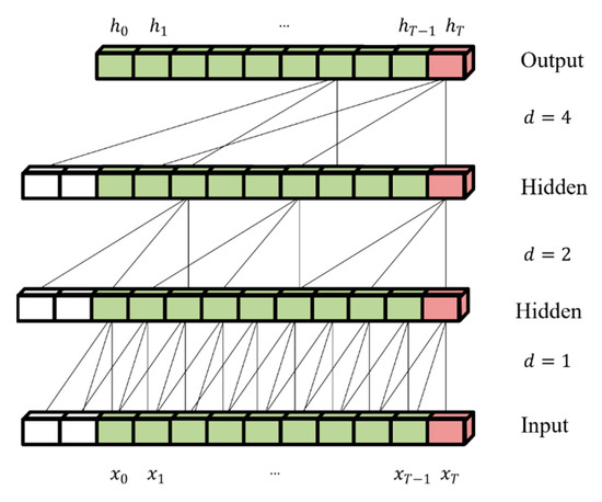 The TCN mainly includes three basic features: causal convolution, dilated convolution, and residual connections. The dilated causal convolution illustrated in Figure 6 is obtained by convolving the input with a causal relationship to generate network output. In sequence modeling, causal convolution means that the current moment is only related to the inputs at moment and before. Its mathematical form is described below.