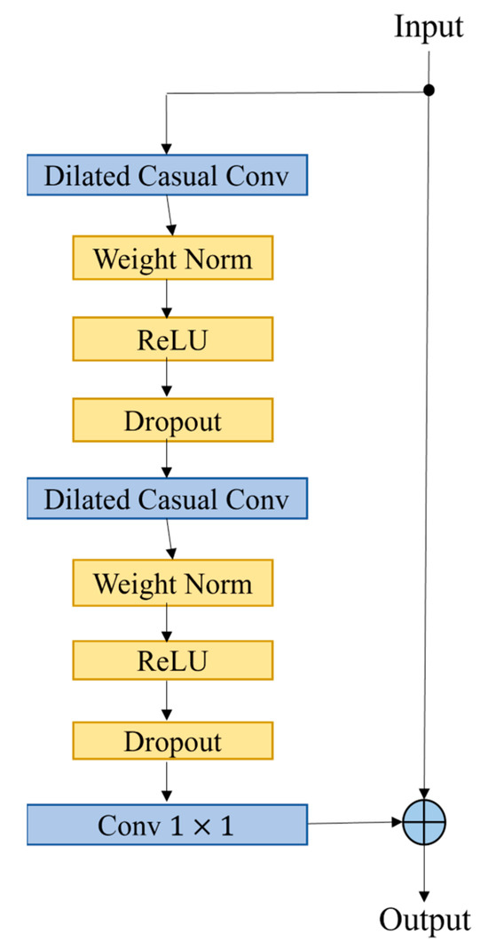 As shown in Figure 8, within the residual block, the TCN comprises two layers of dilated causal convolutions and nonlinear processing, where Rectified Linear Units (ReLU) are used. For normalization, weight normalization is applied to the convolutional filters. Additionally, after normalization through dilated convolution, a spatial dropout is incorporated in each layer to deactivate some neurons, thus avoiding overfitting.