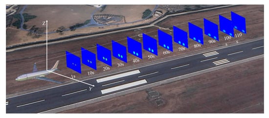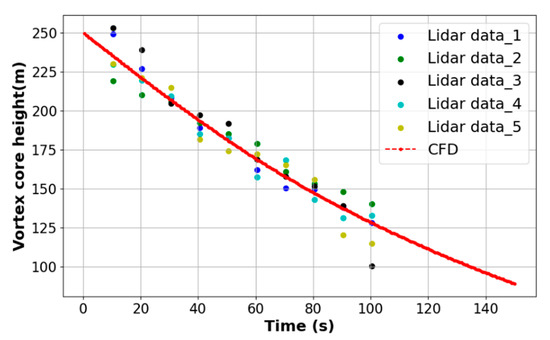 We selected five LIDAR datasets of the A330-200 model under near-calm wind conditions (less than 2 m/s), extracted the evolution patterns of the vortex core height of the aircraft wake, and compared these with the evolution patterns of the vortex core height obtained from the CFD data at corresponding times, as shown in Figure 12. The results indicate that the CFD evolution data obtained through simulations closely match the aircraft wake evolution patterns detected by the LIDAR in the field.