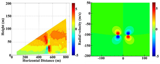 According to the Beaufort Scale, wind speeds below force 1 are defined as calm, which corresponds to wind speeds less than 1.5 m per second. The evolution data of the wake vortex for the A330 model are filtered at wind speeds close to calm (below 1.5 m/s), and the numerically simulated wake vortex radial velocity is compared with the laser radar-detected wake vortex radial velocity. As shown in Figure 11, the left is a mapping of actual LIDAR data, with the LIDAR placed 350 m from the runway; the right is a mapping of data obtained from numerical simulations. It shows two sets of velocity pairs in opposite directions, with the maximum radial velocity around 5 m per second. The distribution of the velocity pairs satisfies rotational symmetry. Both the x-axis and y-axis are in meters; the x-axis represents the distance extending horizontally from the vortex center, and the y-axis represents the distance extending vertically from the vortex center.