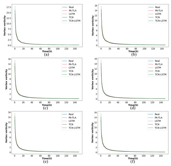 To further demonstrate the effectiveness of the PA-TLA, we constructed a TCN-LSTM structure composed of a two-layer convolutional stacked TCN and a three-layer LSTM in series, as illustrated in Figure 14a–f. This figure shows a comparison of predicted and actual vorticity characteristic parameters for four models, all of which exhibit high levels of fit: PA-TLA, TCN-LSTM, LSTM, and TCN.