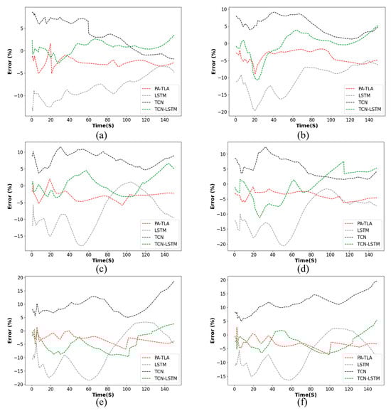To further observe the prediction errors of the four models, Figure 15 presents the relative error plots for the predicted vorticity characteristic parameters. This figure demonstrates the models’ performances at various distances, with time on the x-axis and vorticity on the y-axis. It is evident that the TCN, with its capability to perceive spatial features of the sequence, performs better in terms of relative error compared to LSTM. Both PA-TLA and TCN-LSTM, which integrate the spatial feature perception of the TCN with the temporal feature perception of LSTM, show good performance in predicting aircraft wake characteristic parameters, with PA-TLA outperforming TCN-LSTM in relative error.