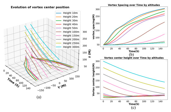 Evolution of vortex core position of aircraft wake at different heights ((a) represents the three-dimensional variation curve of the vortex center of the aircraft wake, (b) represents the evolution of the longitudinal position of the vortex center, and (c) represents the evolution of the distance between the two vortex centers).