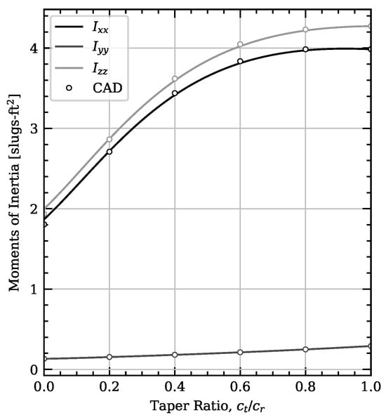 The evaluation results for the moments of inertia are shown in Figure 5. The Lanham results are not shown in Figure 5 because they are off by an order of magnitude for each moment of inertia and make the corresponding relationships difficult to see. Note the offset values at small taper ratios (particularly ) are due to the nonlinearities mentioned previously.