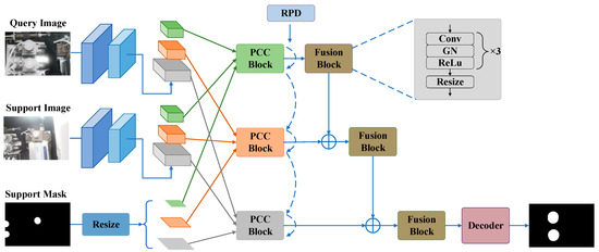 The overall architecture of our PCNet is illustrated in Figure 1. The input of PCNet is a query image and several support images with fine annotated masks. Segmentation of the query image is desired as the output. Firstly, the pre-trained ResNet50 [48] is selected as the shared feature extractor between the support and query paths with frozen parameters. Secondly, in the last three blocks of the backbone, we design novel pixel-wise and class-wise correlation blocks (PCC blocks) for mining dense semantic relationships between support and query features. Specifically, we construct prototypes using support features and corresponding resized masks for each layer in each block. Abstract deep prototypes reverse global semantic cues to shallow layers through distillation (reverse prototype distillation, RPD), forcing shallow prototypes to learn more explicit semantic information. Thirdly, all features of each block are fused using a simple fusion module, and features from multiple blocks are combined by hierarchical fusion. Finally, the results are obtained through a decoder consisting mainly of convolutional and upsampling layers. We will explain our model in detail in the following sections, with a focus on PCC blocks and RPDs under the 1-shot setting.